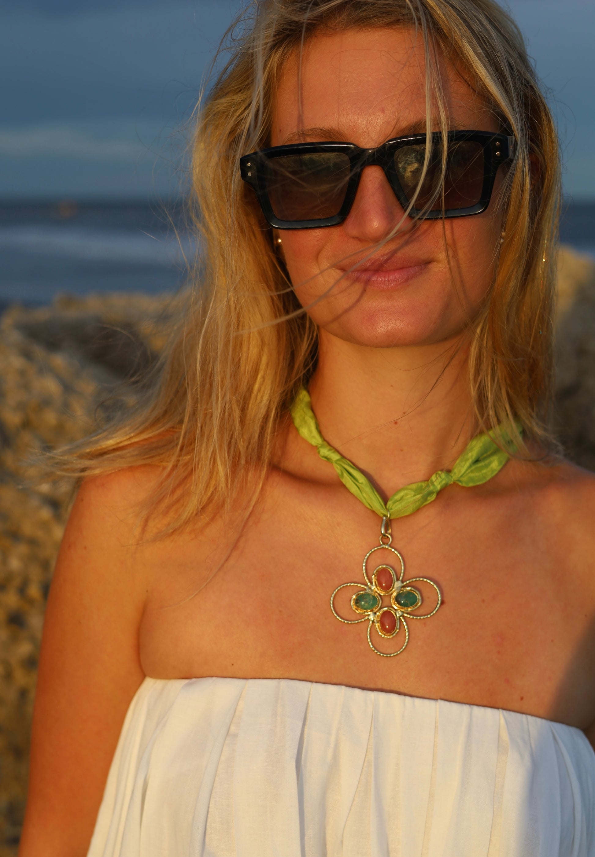 The Amelia necklace features a stunning gold-toned floral design with four symmetrical loops, each adorned with a vibrant oval gemstone at the center paired with a chartreuse100% silk scarf