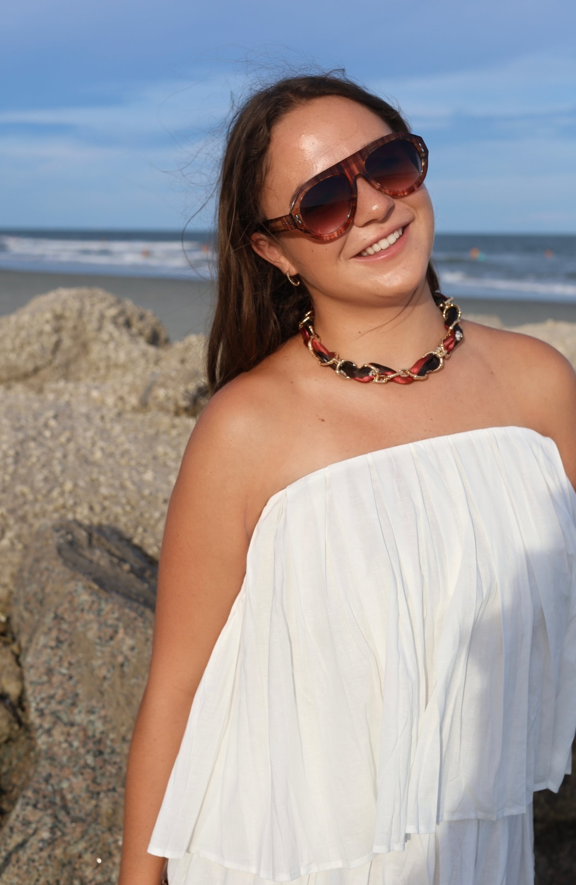 The Brice Necklace features two wrap scarves weaved through a stunning gold chain. Elevate any game day outfit with this stunning piece!
