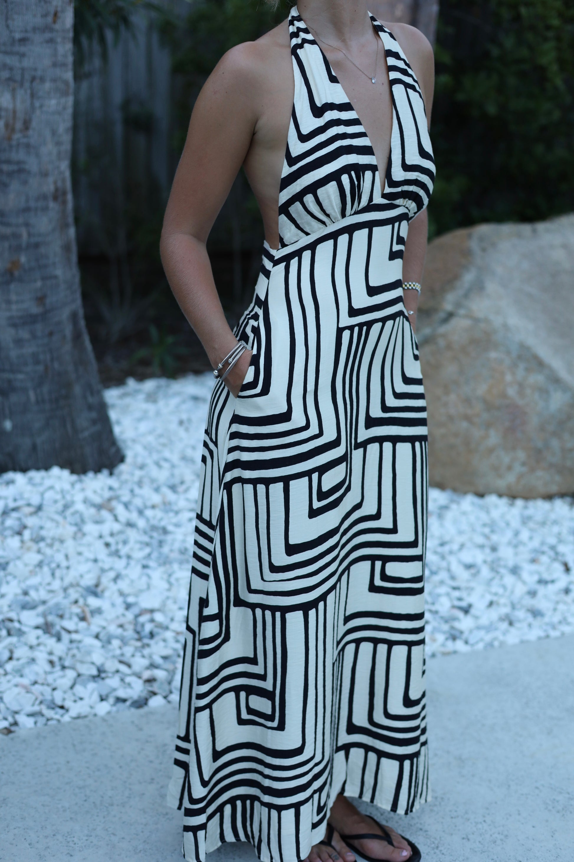 Indulge in effortless style with the Jane Dress. This halter dress features pockets, making it perfect for beach trips, dinners, and girls' night. The intricate design and lightweight fabric create a chic and comfortable look that is perfect for any occasion. Embrace the Bohemian vibe and elevate your wardrobe with this must-have!!