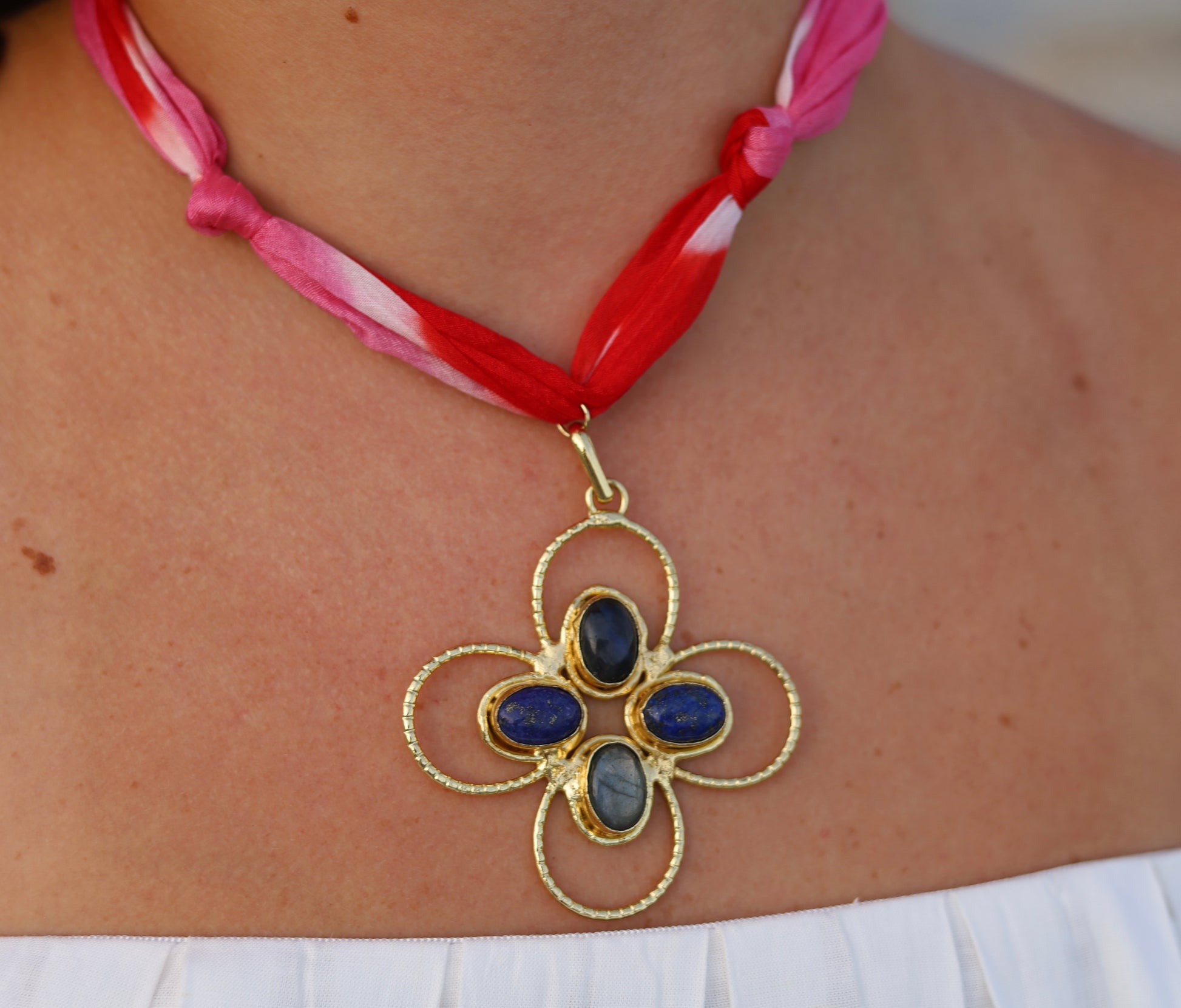 This pink and red tie dye scarf features a flower gemstone pendant that brings a fun pop of color to any outfit